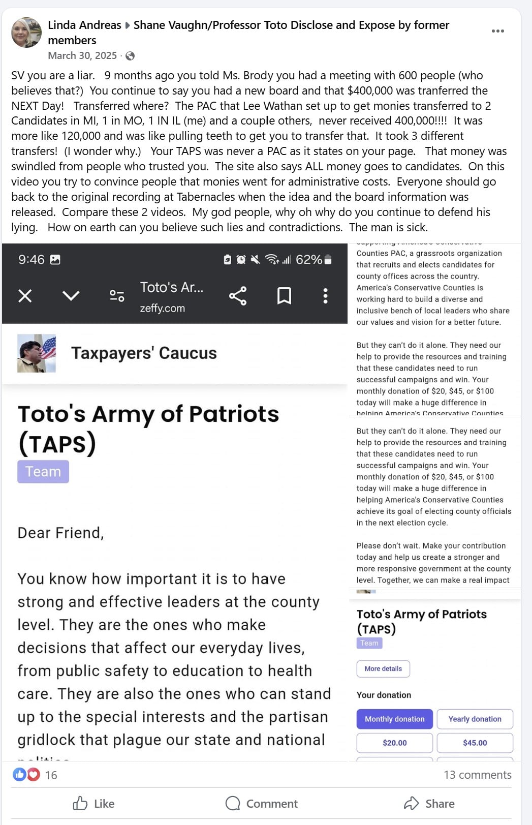 “You continue to say you had a new board and that $400,000 was transferred the NEXT day! Transferred where?” Andreas wrote. “The PAC … set up to get monies transferred to 2 candidates in MI, 1 in MO, 1 in IL (me) and a couple others never received $400,000!!!! It was more like $120,000 and was like pulling teeth to get you to transfer that.” She then alleged that the same funds were “swindled from people who trusted you.”